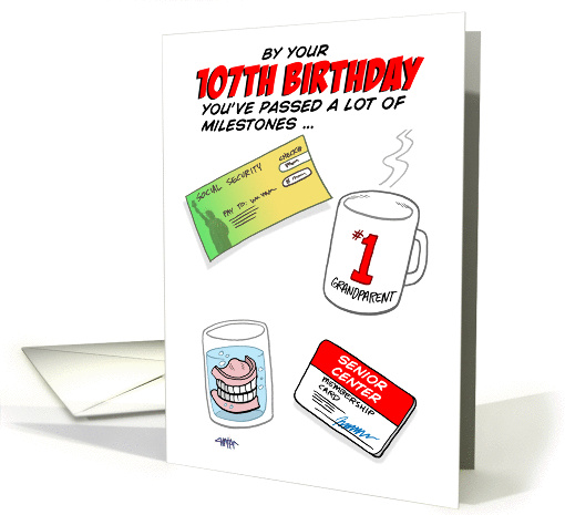 Funny birthday card which has dentures, a social security check, a senior center card, and a '#1 Grandparent' mug on the front. Title of the card reads: "By your 107th birthday you've passed a lot of milestones..." Give a little laughter to somebody today with a zany Cartertoons humor card, only by Jon Carter!