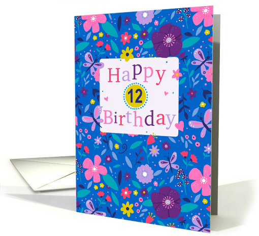 Modern Happy 12th Birthday greetings card with lots of girly flowers of pinks, lilacs and purples on a bright blue glossy background card. ©DaleSimpson