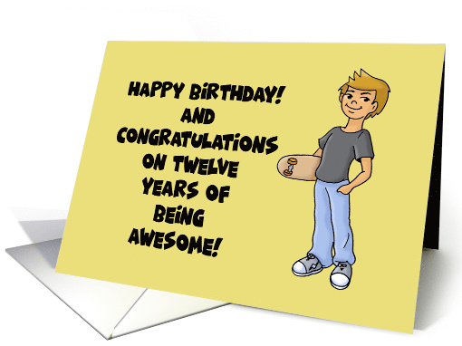Humorous 12th Birthday Card for a boy, with a cartoon showing a boy with a skateboard on a yellow background. The words say: Happy Birthday! Congratulations on twelve years of being awesome! Inside says: Keep it up!
