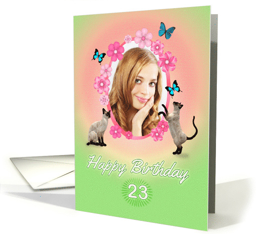 A pair of playful siamese cats chasing butterflies. A photo of the birthday person is framed in flowers. Add a picture and a name to create a really cute 23rd birthday card.