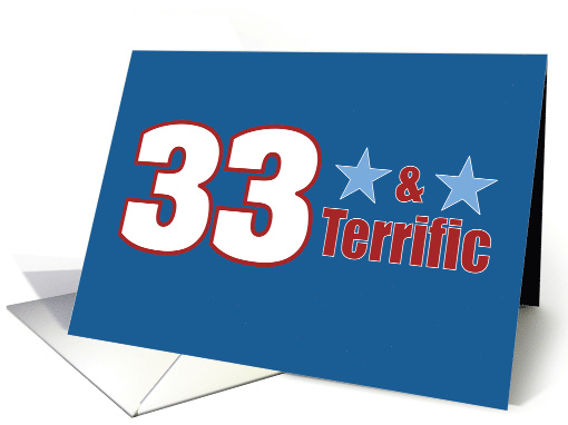 Let the 33 year old birthday man know you're thinking of him with this fun 33rd birthday card! It says 33 & Terrific in a red, white and blue color scheme with blue stars! Great for any male relation!