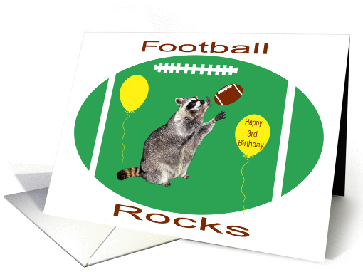 Wish a football lover a Happy 3rd Birthday with an adorable raccoon playing football on a green football shape frame with yellow balloons on a white background with brown text. Inside, like all cards on GCU can be personalized by you if you wish.
