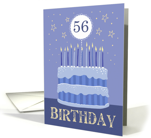 56th Birthday Cake greeting card design in shades of Blue and with distressed style lettering, set on a glossy card. ©DaleSimpson