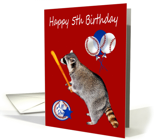 5th Birthday, raccoon holding a baseball bat on red with balloons