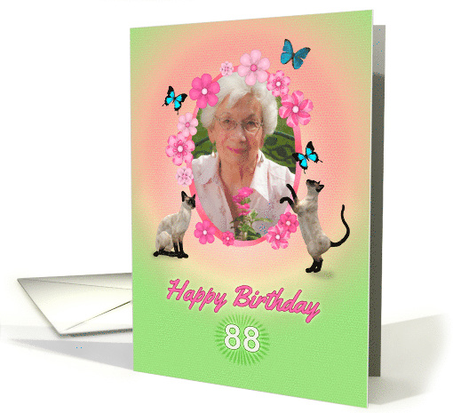 A pair of playful siamese cats chasing butterflies. A photo of the birthday person is framed in flowers. Add a picture and a name to create a really cute 88th birthday card.