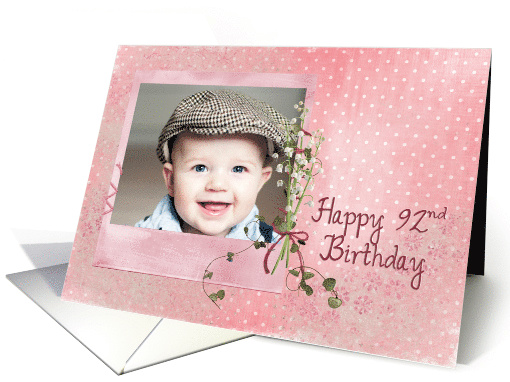 Old-fashioned photo frame with lily of the valley bouquet on pink pin dot faded background for 92nd birthday.