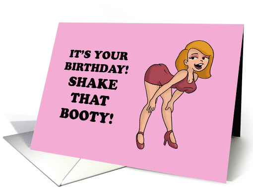 Humorous Adult Birthday Card for a woman with a cartoon woman bending over (accenting her rear) on a pink background. The words say: It's your birthday! Shake that booty!! Inside says: Hope you have a great time!