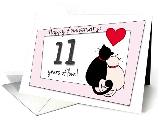 This jazzy card is great for any couple celebrating years together! It features two cats snuggling on their 11th wedding anniversary. A heart hangs dreamily over their heads.