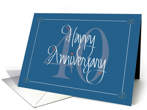 This richly toned sea foam blue anniversary card is the ideal way to congratulate a couple honoring their 40th Wedding Anniversary together. Against the background of brilliant blue are the artistically hand lettered words "Happy Anniversary", which are overprinted on a large numeral "40" that fills the background with the number of years the celebrants have shared love together. Small hearts add love and bright pink color to the center of the card, inside the thin white border that has corners marked with golden wedding rings. The inside wording of the card is "Celebrate yesterday's memories, today's joys and tomorrow's hopes, as you honor your love on this special day. Happy 40th Anniversary."