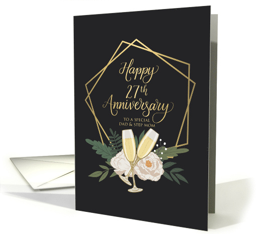 Send your wedding anniversary wishes with this lovely modern boho card illustrated with a faux gold geometric frame decorated with wine glasses, peonies, berries and leaves with the elegant faux gold hand lettered words 'Happy 27th Anniversary' by Ness to a special dad & step mom. © Ness Nordberg