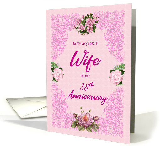 A 38th anniversary card for your wife. An elegant tracery in pink sets of the four pink roses. The background is a pale pink pattern of flowers. A lovely card to send to your wife on your wedding anniversary.