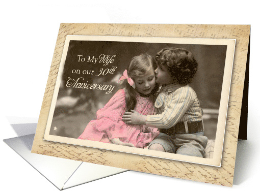This card serves not only as a beautiful keepsake but also as a touching tribute to a wife, honoring the enduring love and commitment that have grown stronger with each passing year. The muted, pastel color palette enhances the nostalgic feel, evoking a sense of timeless romance and enduring affection. This delicate and charming design perfectly symbolizes the deep bond and cherished memories shared over thirty years of marriage.