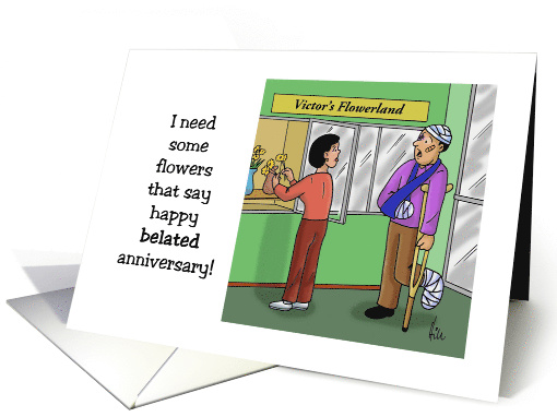 Anniversary card with a cartoon of a man, who has been beaten up with broken bones and bruises, in a flower shop. He says to the woman, I need some flowers that say happy belated anniversary!