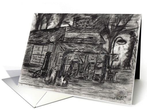 I sketched this picture in charcoal pencil with my two cats named Cosmo and Paw Paws. Cosmo is black and white and Paw Paws is an orange colored cat. They love to be noisy and curious. The gas station and cafe are from my memory of the many old gas stations and cafes that dotted the country side across the USA from the 40' 50's and 60's.
