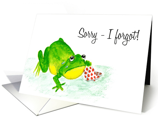 A hand painted watercolor green frog is crying because he forgot to send your birthday card! 'Happy Belated Birthday' inside (but you can change this to use it for a forgotten anniversary or other occasion.)