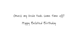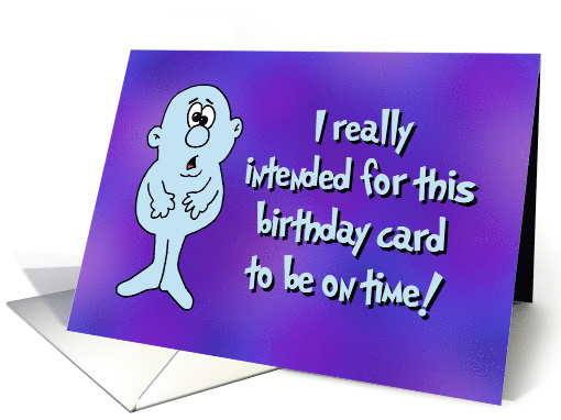 Humorous Belated Birthday card with a cartoon character. The words say, I really intended for this birthday card to be on time! Inside says, Guess my brain took some time off! Happy Belated Birthday