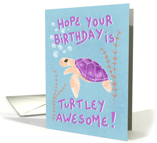 The image shows a birthday card with a subsea design in soft tones. The blue background simulates the ocean, decorated with bubbles and algae. In the center, there is a sea turtle with a purple shell and details in warm tones. It says "Hope your birthday is turtley awesome"