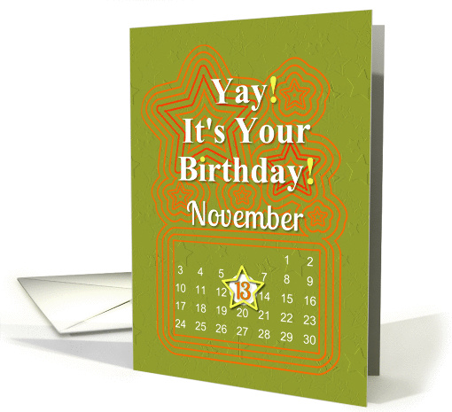 Make the November 13th birthday person on your list feel extra special with this fun,cheerful orange,green and yellow card that has a November calendar with their special day denoted with a star. Original digital art design by Betsy Bush of Birthday Cards Cafe'.