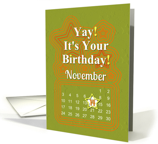 Make the November 14th birthday person on your list feel extra special with this fun,cheerful orange,green and yellow card that has a November calendar with their special day denoted with a star. Original digital art design by Betsy Bush of Birthday Cards Cafe'.