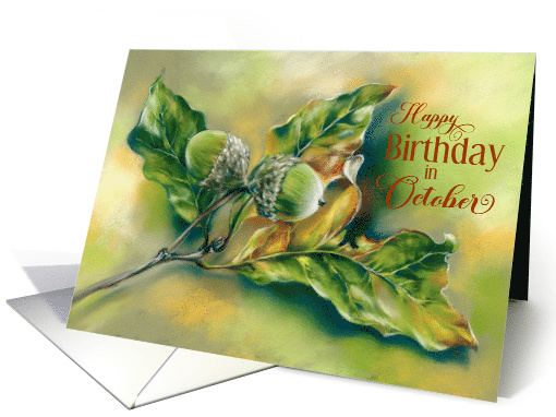 A striking card for anyone born in the month of October, this birthday design features autumn botanical artwork depicting acorns on a twig with a trio of colorful oak leaves rendered in soft pastel shades of seasonal gold and green with dark blue accents.