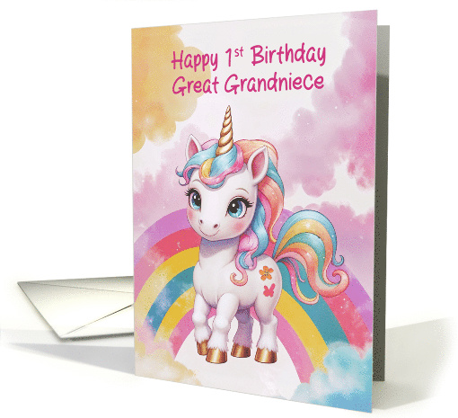 Celebrate your great grandniece’s very first birthday with this sweet unicorn card, filled with gentle pastel tones and magical delight. A beautiful white unicorn with sparkling golden hooves and a soft spiral horn stands beneath a pastel rainbow, nestled in a dreamy sky of blush and peach clouds. Her flowing mane and tail swirl in soft waves of aqua, pink, and gold, while butterfly-shaped markings on her flank add a storybook touch of whimsy. Digitally illustrated with warmth and charm, this card is perfect for her very first celebration. “Happy 1st Birthday Great Grandniece” appears in joyful pink script—a beautiful keepsake for a treasured little one.