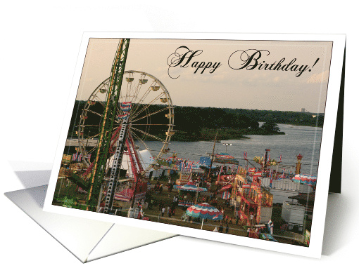 An image of a carnival or fair in Florida against a lake. A Ferris wheel and lots of vibrant carnival colors are shown on the card as it is at twilight. The text at the top right reads "Happy Birthday" in black script font.