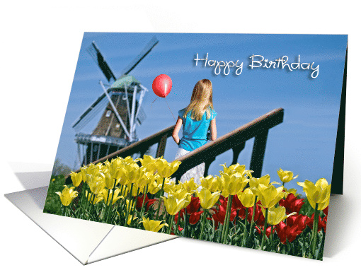 Birthday, Dutch windmill with tulips and girl with balloon