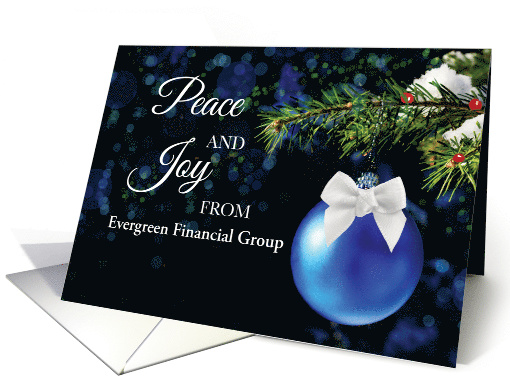 This customizable holiday design features a shimmering blue ornament with a white bow, accented by berries on a pine bough. Created especially for financial services organizations, it allows you to add a custom company name to the front for a personal touch. A professional and heartfelt way to share appreciation and seasonal joy with clients, staff, or partners.