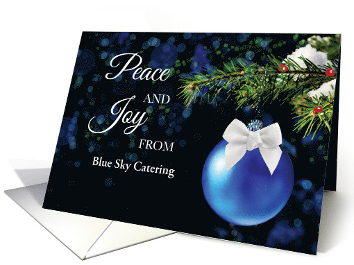 A festive design with a brilliant blue ornament tied with a white bow, accented by berries on a pine bough. This version is tailored for restaurants, caterers, and food service companies who want to share warm holiday wishes with their clients and staff. Its elegant seasonal look paired with a customizable name makes it an inviting way to express gratitude and celebrate the relationships that help your business thrive during the year.