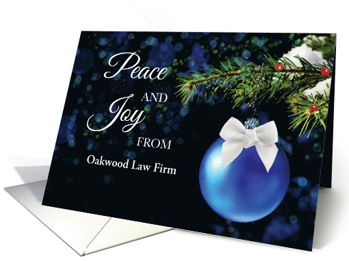 An elegant holiday design with a blue ornament and white bow, accented by festive berries on a pine bough. Created especially for law firms and legal service organizations, it includes space for a custom company name on the front. With its polished look and customizable inside message, this card offers a thoughtful way to thank clients, colleagues, and staff while conveying trust, appreciation, and holiday goodwill.