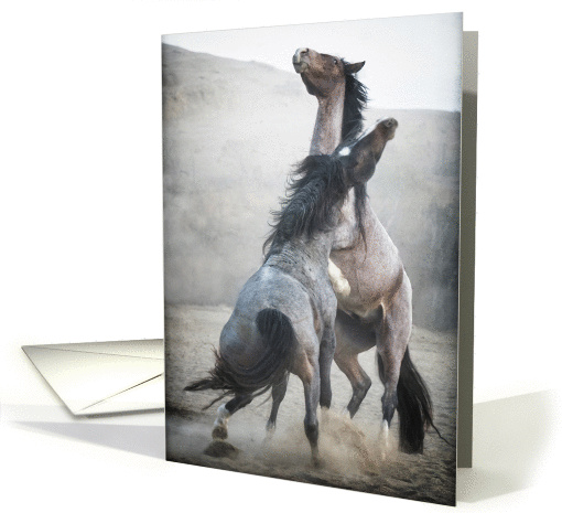 Two young stallions challenging each other for dominance with dust all around them from kicking it up. Both on hind legs sparring with each other. Blank note card, any occasion.
