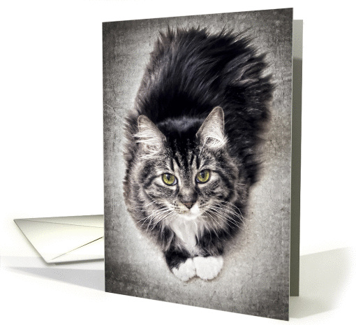 My cat who is mixed with tabby, rag doll and maine coon knows she is beautiful and is always ready to model. Staring into the camera lens her green eyes always bright and full of love. Felines are usually inquisitive and wonderful companions. Blank note card, any occasion.