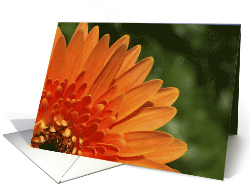 This all-occasion greeting card features a photograph of a beautifully-lit bright orange gerbera daisy. The flower pops against the green background.