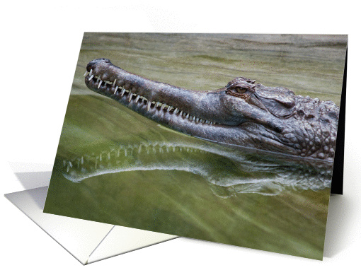 An alligator pokes its head above water just far enough to reveal a sneaky, toothy grin. This blank photo note card makes a dynamic and memorable statement.
