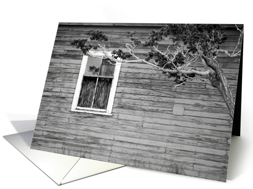 A black and white photography notecard featuring a vintage house in Nevada with a white window and just one glass pane left with an angling juniper tree.