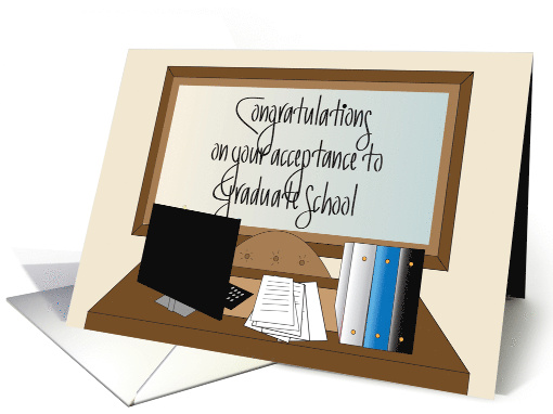 Say congratulations to someone recently accepted to Graduate School with this fun card that features a desk overflowing with notebooks, unruly papers and a computer and black keyboard. The hand lettered message, "Congratulations on your acceptance to Graduate School", is written on the glass window, behind the desk. The inside wording is "Best wishes, as you begin following your dreams."