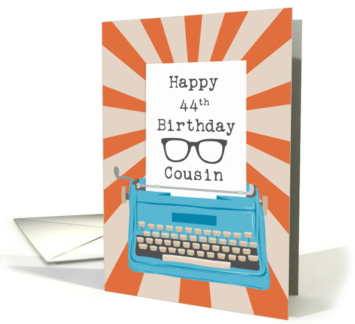 A blue vintage typewriter with a sunburst background. A piece of paper from the typewriter which has the words Happy 44th Birthday Cousin in typewriter font and a silhouette glasses. A retro birthday card for your wonderful cousin turning 44!