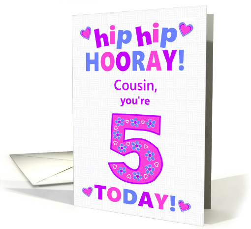 A pretty birthday card for your cousin, with pink, blue and purple lettering on a lightly textured white background, The front cover greeting is, 'hip hip HOORAY! Cousin, you're 5 TODAY! The magenta number 5 is extra-large and is decorated with blue flowers and white hearts. There are also tiny, magenta pink and blue hearts in the four corners. The inside message is just a suggestion and you can easily change it or delete it if you prefer something different or no printed inside message at all.