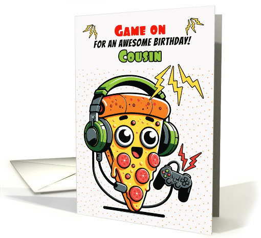 Give fun birthday greetings to your cousin with this pizza guy gamer with headphones and a video game controller. The design also includes colorful lightning bolts.