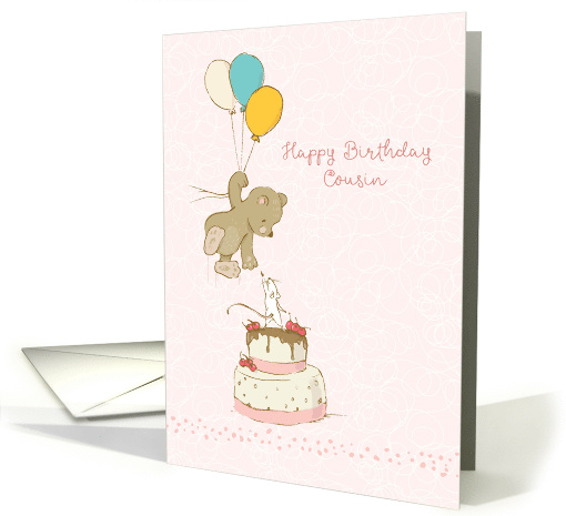 This sweet birthday card is sure to put a smile on your cousin's face. A little bear is floating with three balloons as he greets a white mouse standing on a pretty cake. The abstract background is pink with a cream swirl design.
