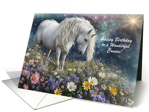 Cousin Happy Birthday with a pretty white unicorn with flowing long mane and forelock and custom text too.