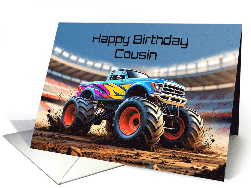 Mark your cousin’s birthday with this bold monster truck card, full of energy, spirit, and pride. A brightly painted monster truck, decorated in electric blues, yellows, and purples, roars across a stadium, its giant orange wheels sending up clouds of dust. This card celebrates a cousin who lives every day with fearless ambition and adventurous heart. It’s a high-powered, action-filled way to show how proud you are of them — and to wish them a birthday packed with excitement, bold dreams, and thrilling new memories.