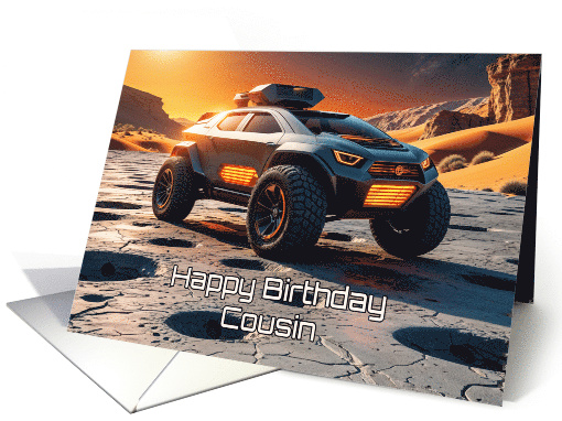 Celebrate your cousin’s birthday with this futuristic, full-throttle space buggy card bursting with energy and style. A sleek vehicle speeds through a glowing canyon trail, orange lights trailing across a red-toned Martian plain beneath a golden sky. The bold terrain reflects the bond you share—full of memories, laughs, and journeys that never feel too far from home. For a cousin who’s part teammate, part partner-in-crime, and always full of character, this card is a cinematic tribute. A birthday celebration as fun, fierce, and unforgettable as the bond you share.