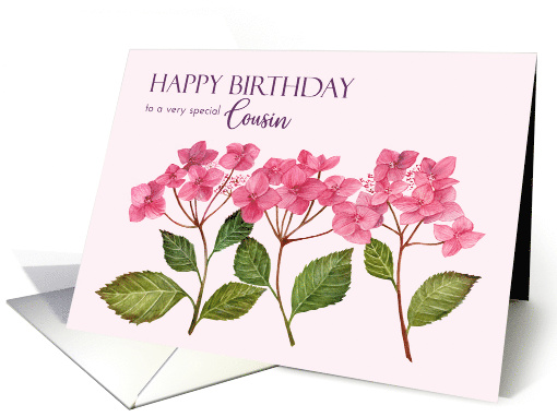 Share the beauty of nature with our elegant greeting card, featuring a stunning watercolor illustration of pink hydrangea lacecaps. This botanical design is sure to uplift spirits and bring a touch of summer joy to anyone who receives it. The card design is for Cousin on Birthday.