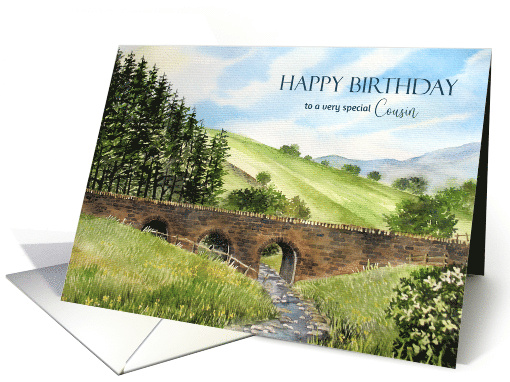 Send a piece of the North of England to someone special with this delightful greeting card. Watercolor painting by myself Farida Greenfield of Scawgill Bridge over River Aiken in Lake District. A lovely peaceful scenery of the rolling hills on the background of the bridge and conifers leading to Whinlatter Pass with gentle stream running underneath the bridge. The beautiful landscape is sure to evoke a sense of calm and tranquillity, perfect for sending warm wishes to your loved ones. The card design is for Cousin on Birthday.