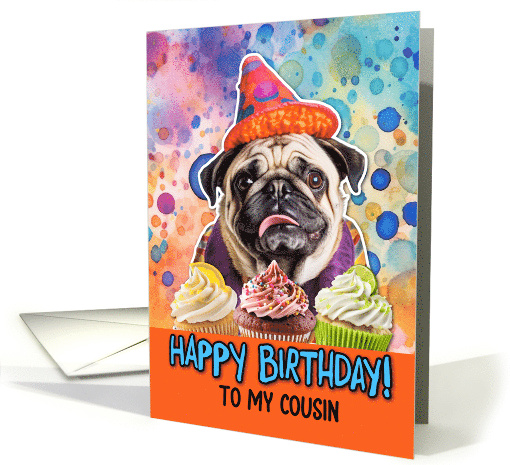 A festively dressed pug on a colorful watercolor background is briging yummy cupcakes to the birthday party. Text on the design reads "Happy Birthday! to my Cousin" A perfect card to send to your cousin for their happy day.