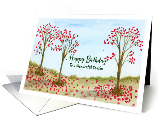 Send an adored Cousin this watercolor-illustrated Happy Birthday card to wish them a very happy birthday on their special day. The card depicts a fall pastoral setting with red leaf trees and falling leaves.