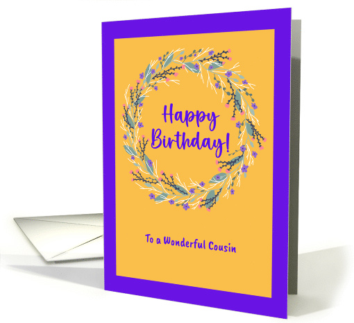 This elegant birthday card for your wonderful Cousin features a botanical wreath bursting with wildflowers in radiant colors, framed by a rich background of orange and purple.