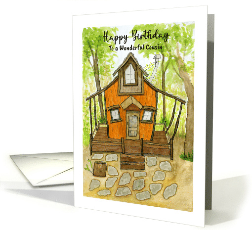 For their special day, send a cherished Cousin this lighthearted Happy Birthday card. A charming rustic cabin hidden away in the middle of a lovely wooded area, surrounded by nature, is shown in this whimsical watercolor artwork.