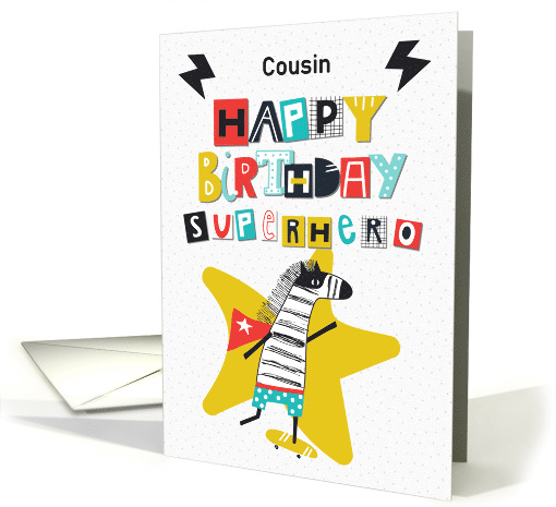 Give your cousin fun and colorful happy birthday greetings with this skateboarding zebra wearing a superhero cape and the sentiment "Happy Birthday Superhero" done in whimsical word art.